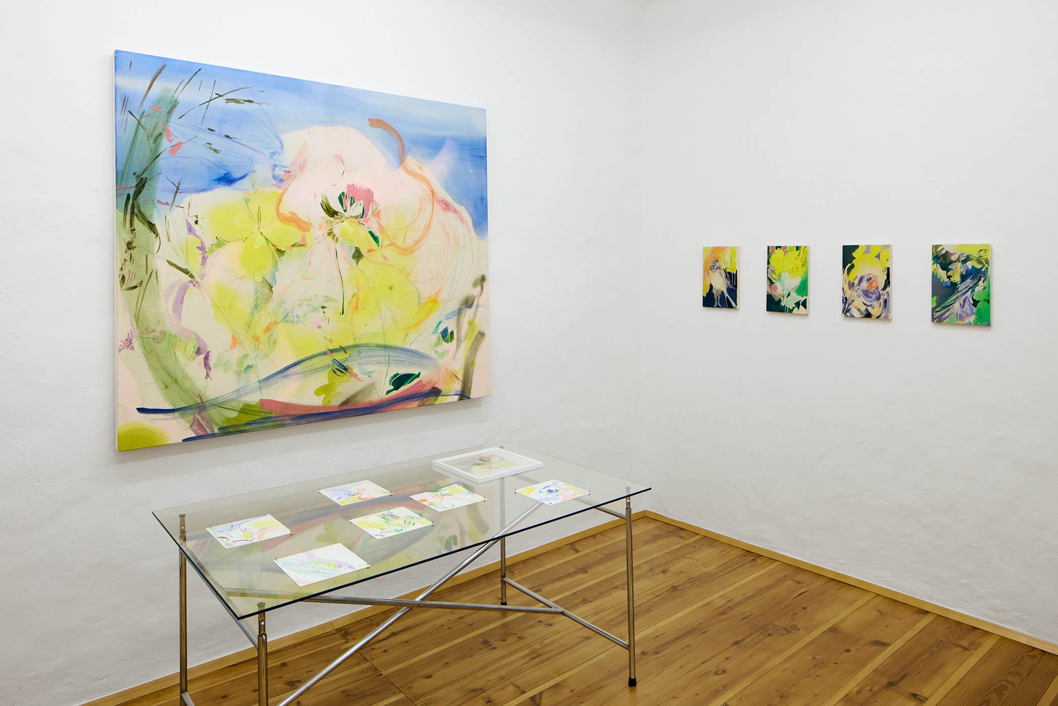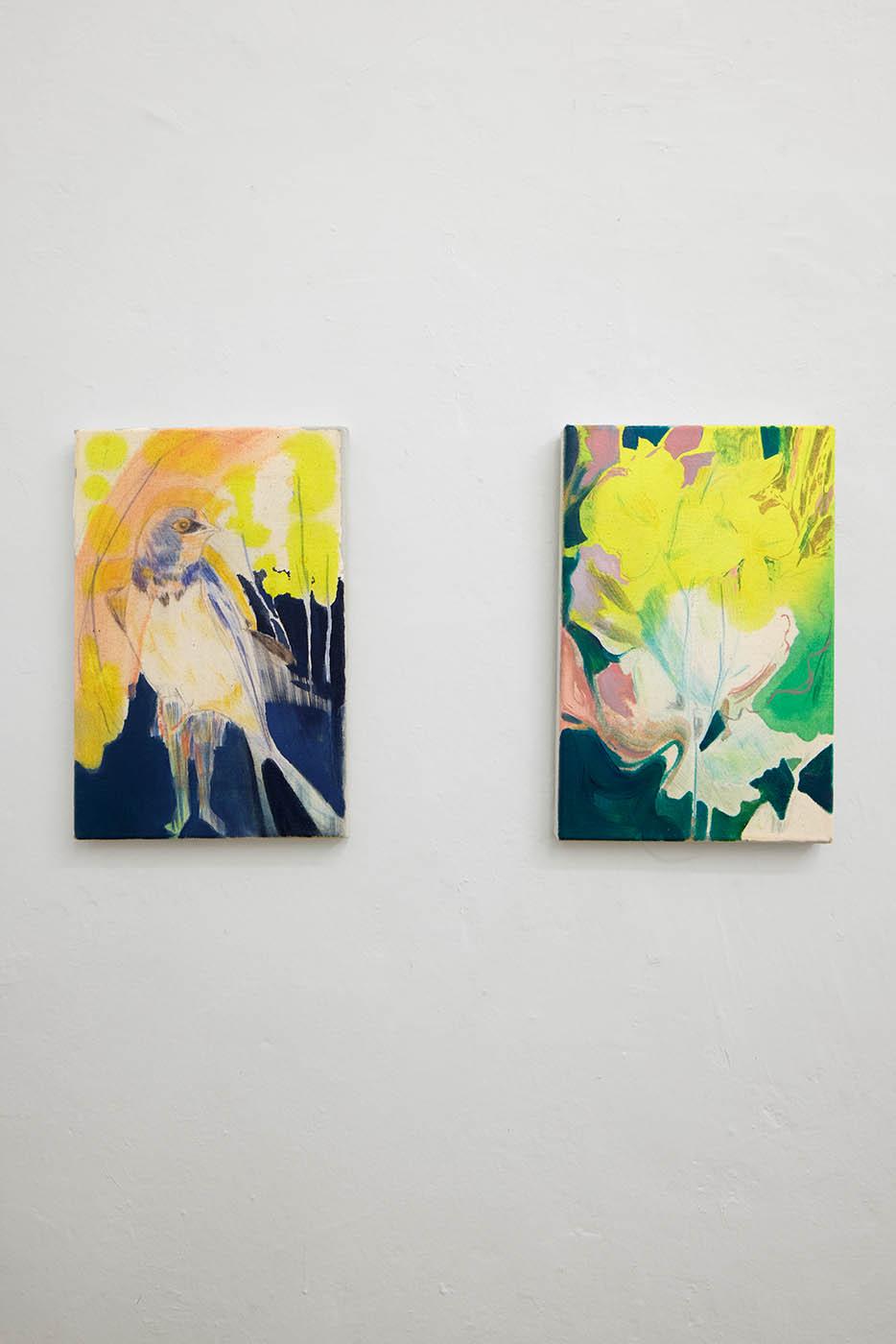 In der Bildserie Follow the Golden-Eyed Swallow stellt Elisabeth Wedenig Natur und Wandel ins Zentrum. Die Arbeiten beziehen sich auf die Pflanze Chelidonium majus (Schöllkraut), deren Name mythologisch mit Schwalben und Gold verbunden ist, und bewegen sich zwischen Gegenständlichkeit und Abstraktion, zwischen Malerei und Zeichnung. Prozesse stetiger Veränderung – wie das Zugverhalten der Schwalben oder das Blühen und Verwelken der Pflanze – werden durch Bewegung, fragmentarische Formen und offene Bildräume sichtbar.