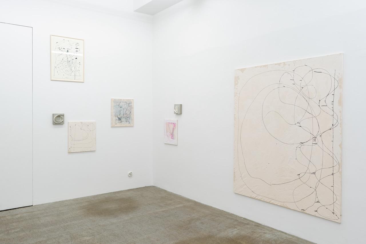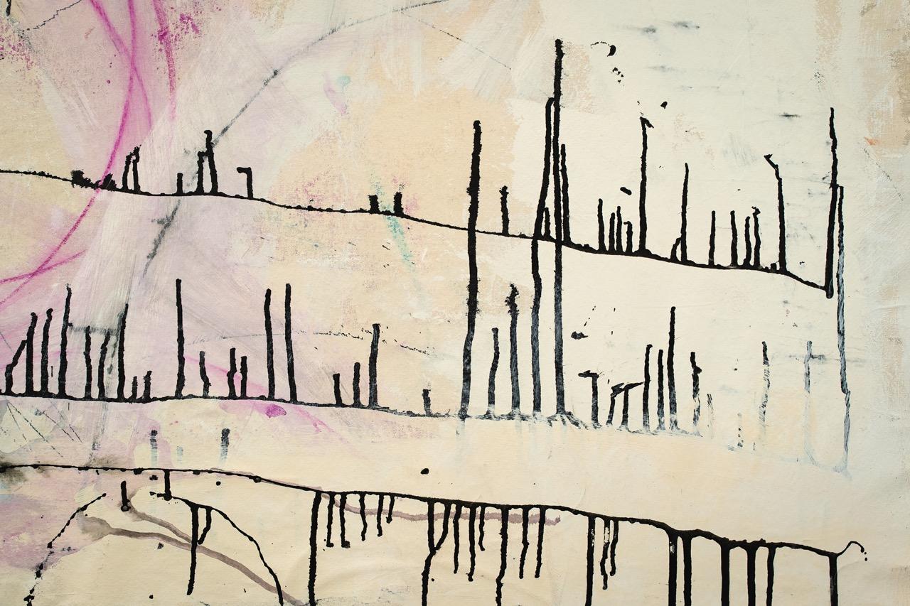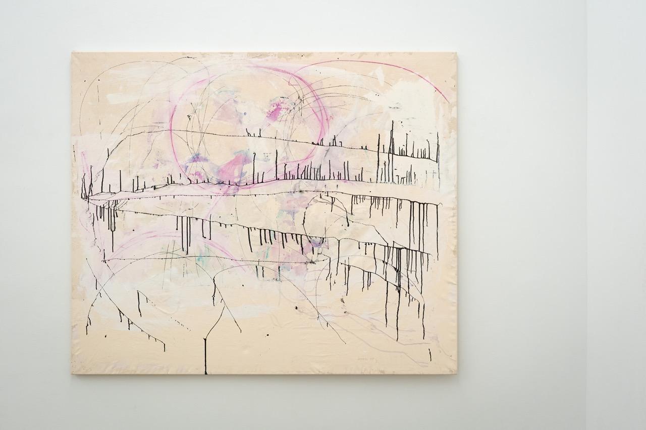 „Durch das Einarbeiten der Grundierung mit der Spachtel bekommt die Leinwand eine Körperlichkeit. Die gestischen Tuschelinien werden durch eine Spritze, auf der eine feine Nadel sitzt, durchgedrückt wie eine Tätowierung. Teils bleibt die Zeichnung für sich alleine stehen, teils setzt sich ein malerischer Prozess fort. Dabei wird sowohl die vordere wie auch die Rückseite der Leinwand bemalt – das Material wird durchdrungen und das Motiv setzt sich aus Farbschichten zweier Seiten zusammen. Die durchscheinende blasse Spur der Farbfläche und die dichte Farbfläche der Bildseite bilden ein palimpsestisches Motiv.