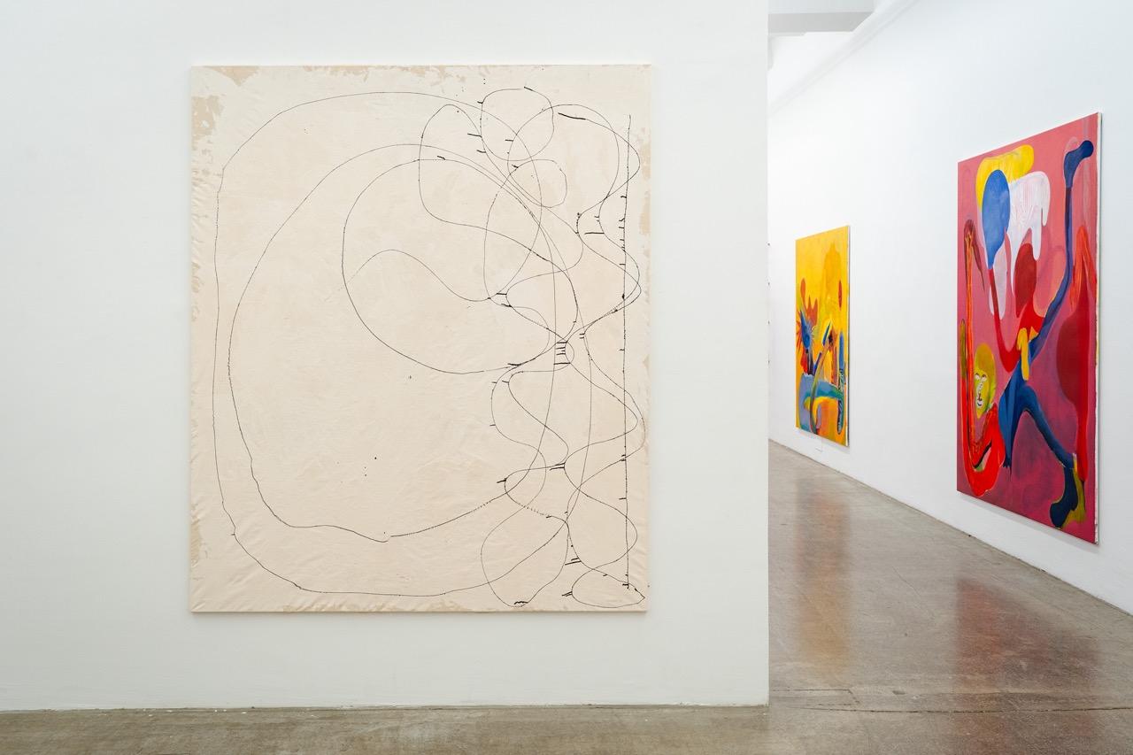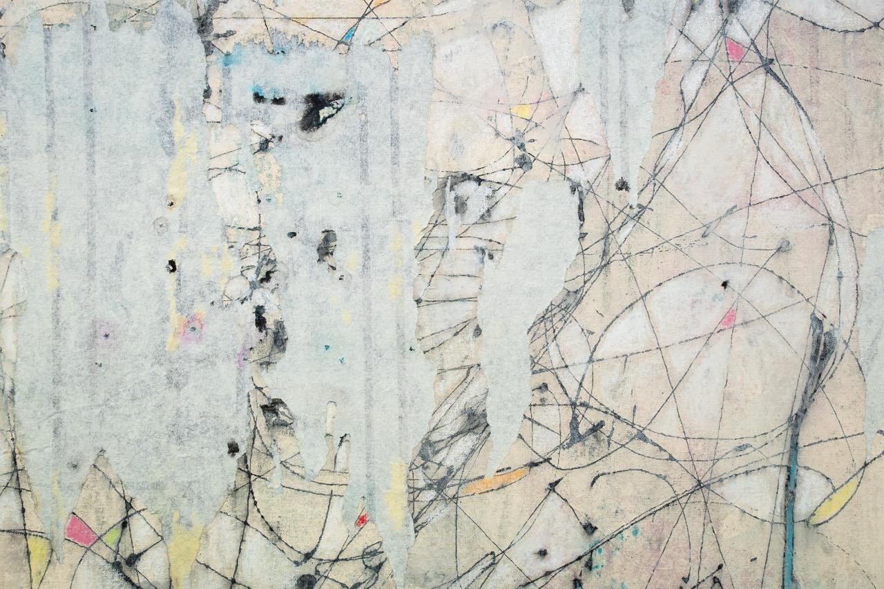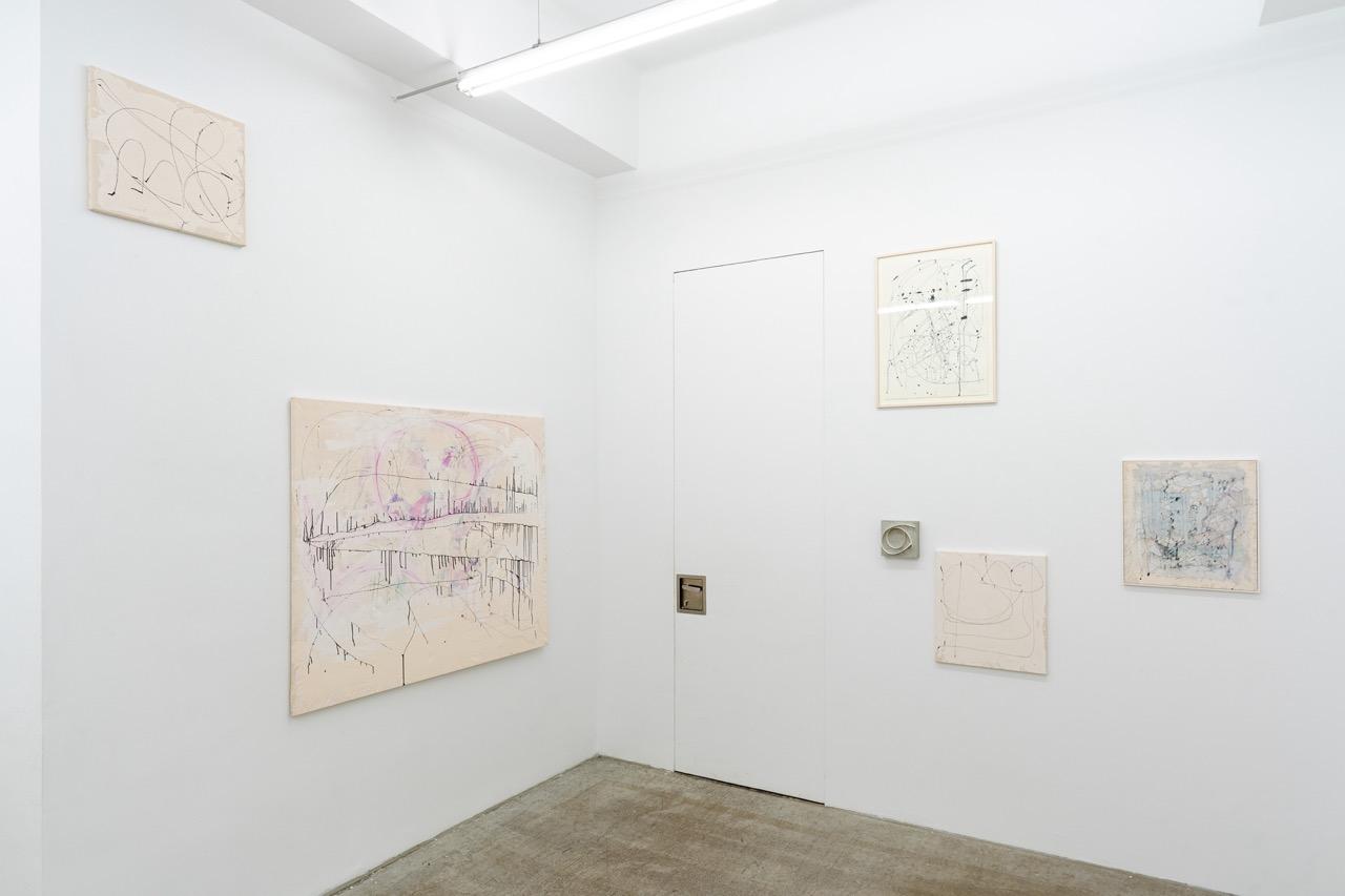 „Durch das Einarbeiten der Grundierung mit der Spachtel bekommt die Leinwand eine Körperlichkeit. Die gestischen Tuschelinien werden durch eine Spritze, auf der eine feine Nadel sitzt, durchgedrückt wie eine Tätowierung. Teils bleibt die Zeichnung für sich alleine stehen, teils setzt sich ein malerischer Prozess fort. Dabei wird sowohl die vordere wie auch die Rückseite der Leinwand bemalt – das Material wird durchdrungen und das Motiv setzt sich aus Farbschichten zweier Seiten zusammen. Die durchscheinende blasse Spur der Farbfläche und die dichte Farbfläche der Bildseite bilden ein palimpsestisches Motiv.