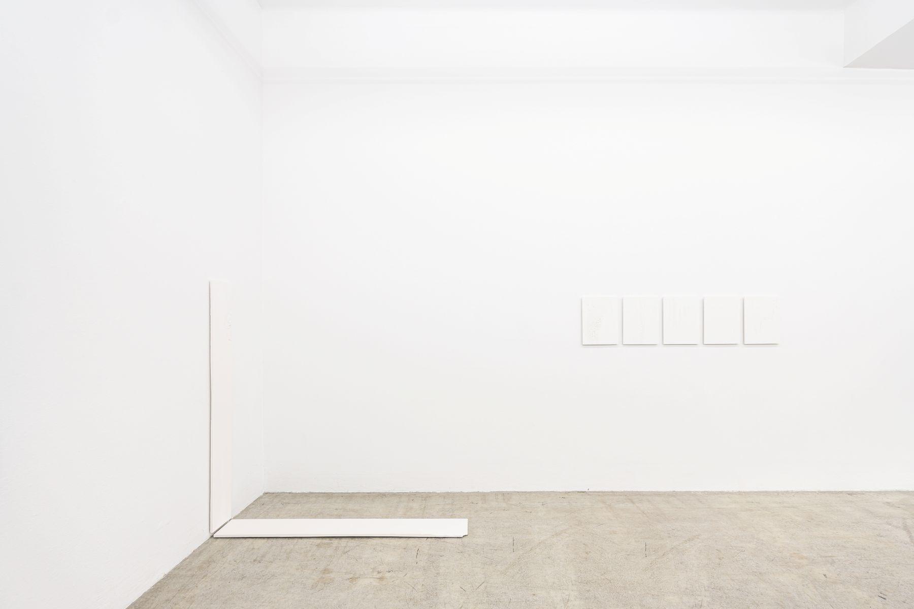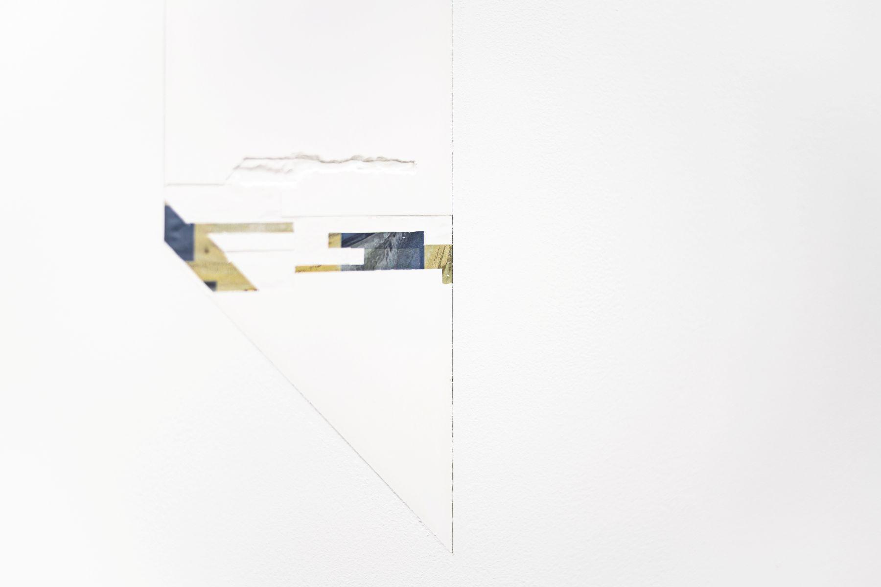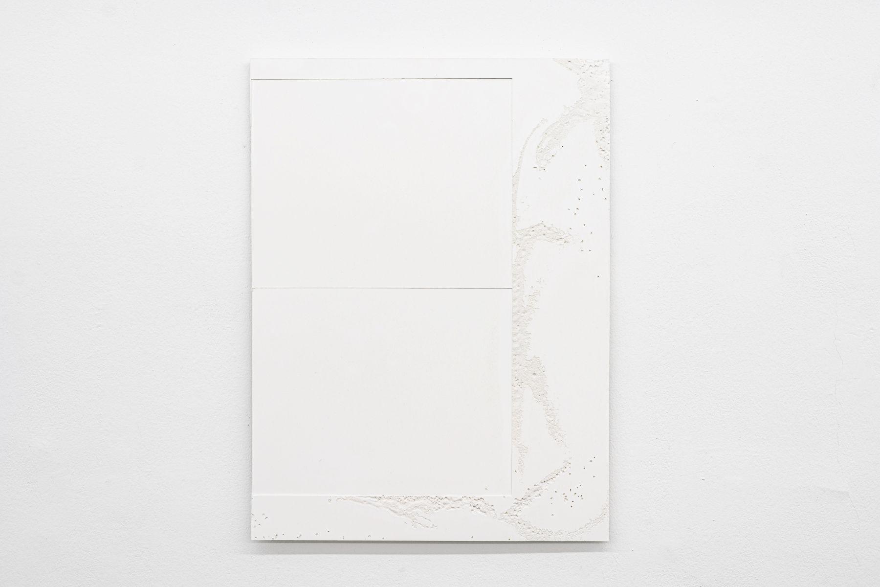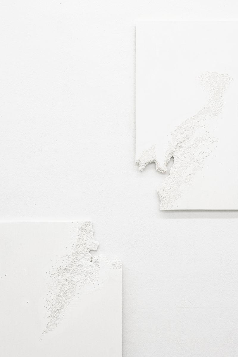 Sophie Dvořák verarbeitet Fragmente ausgewählter Satellitenaufnahmen auch in Gips. Sie gießt das flüssige Material über einzelne Bilder und versetzt Teile der Masse mit Salz. Der Härtungsprozess dauert einige Tage, und in dieser Zeit frisst sich das Salz in die Oberfläche. Ähnlich den Erdbildern der Aralwüste entstehen körnige Krater, Einbuchtungen, Deltas, Erhebungen, ganz ohne weiteres Zutun und eine Einflussmöglichkeit der Künstlerin. Einmal gehärtet und umgedreht, evozieren die Gipsgüsse vollkommen neue, weiße Topografien. Teile der Satellitenbilder, die an sich schon Auszüge aus unterschiedlichen Schichten und Update-Bereichen darstellen, werden wie in einem archäologischen Grabungsprozess freigelegt: Das, was an die Oberfläche geholt, also sichtbar wird, ist kontingent, der Großteil bleibt im Verborgenen. Oft belässt Dvořák den Gips und das Salz für sich, verzichtet in einigen Objekten also auf das (physische) Satellitenbild, das sich dann nur noch als eine Art Echo in der jeweiligen Oberflächenstruktur wiederfindet. Die sich visuell fast auflösenden Reliefplatten gleichen verschwindenden Bildern, zufällig erhaschten Blicken auf eine geologisch sich verändernde Welt, auf Modelle, Abdrücke, Spuren. Immer wieder zeigen die Gipsflächen gebrochene vertikale oder horizontale Linien oder Rillen – auch das scheinbar Spuren der digitalen Erdaufzeichnung. Denn diese simuliert nur ein Oberflächenkontinuum, in dem man sich visuell frei bewegen kann; tatsächlich gehen die Zoom-ins regelmäßig mit „sichtbaren Nähten und Glitches einher – digitalen Störungen, die das [zugrunde liegende] Raster mitunter zu erkennen geben“. [2] Das, was uns als Kontinuum vorgetäuscht wird, ist selbst nur eine Collage aus unterschiedlichsten Aufnahmen. Glitches zeugen von diesem Dis-Kontinuum.