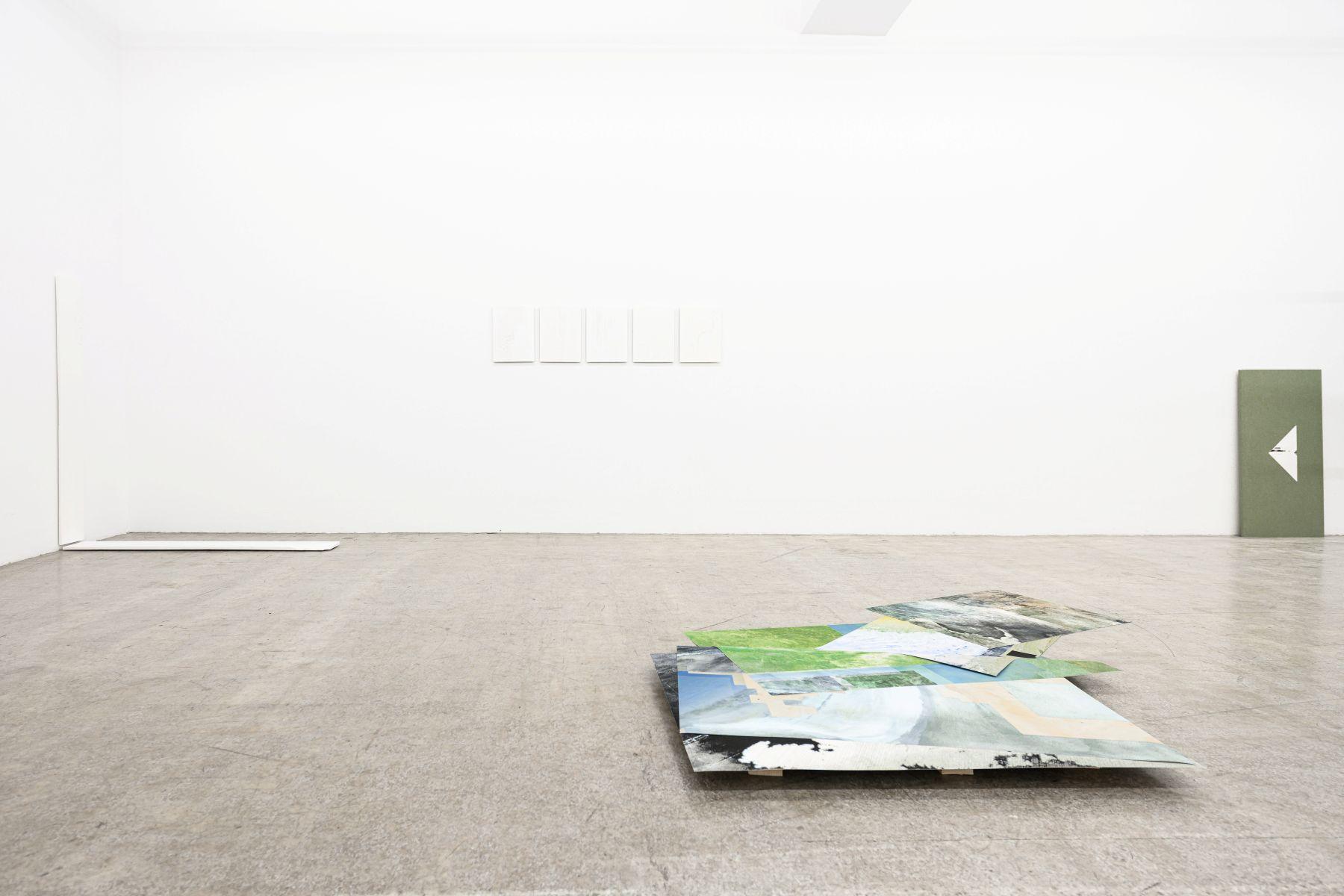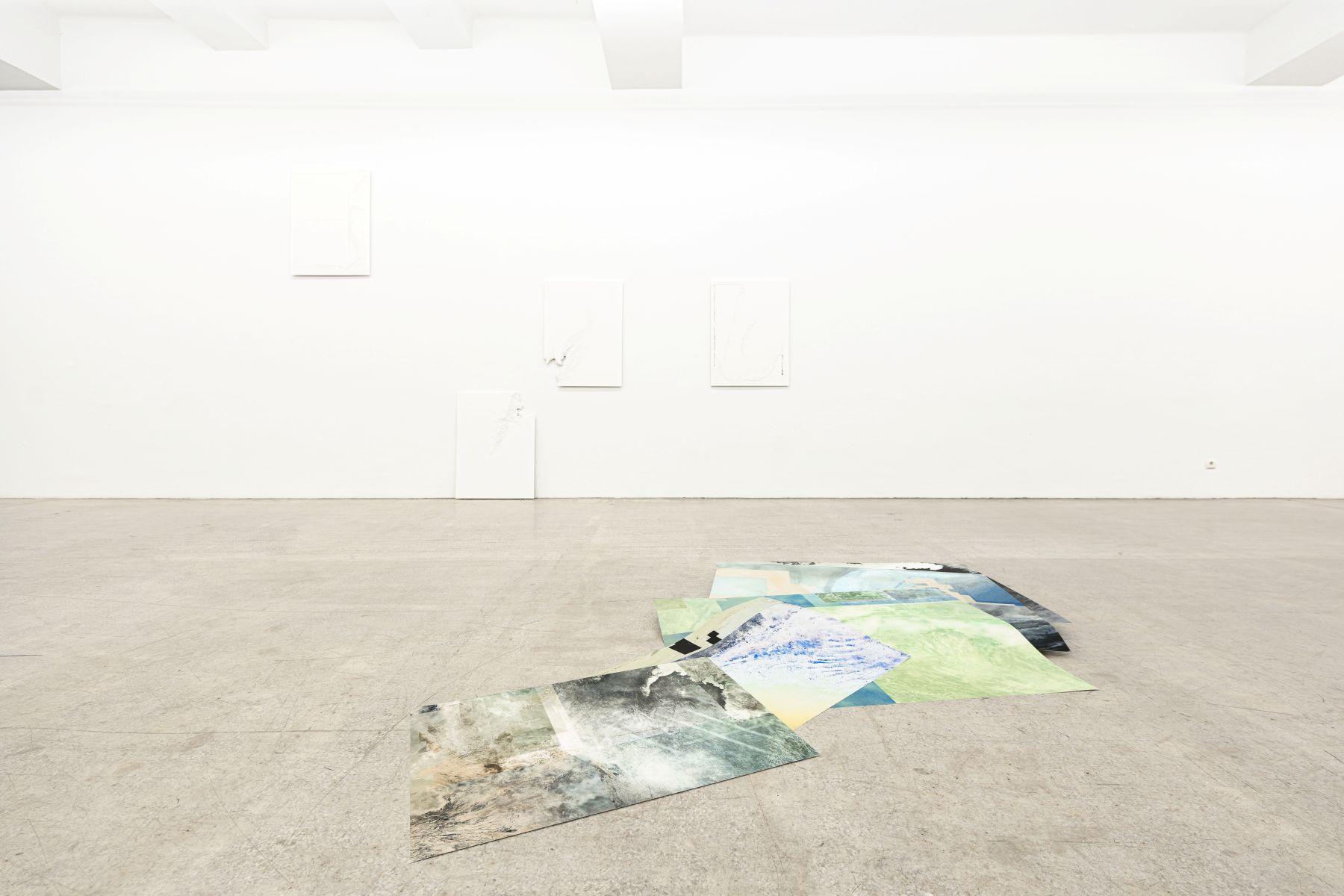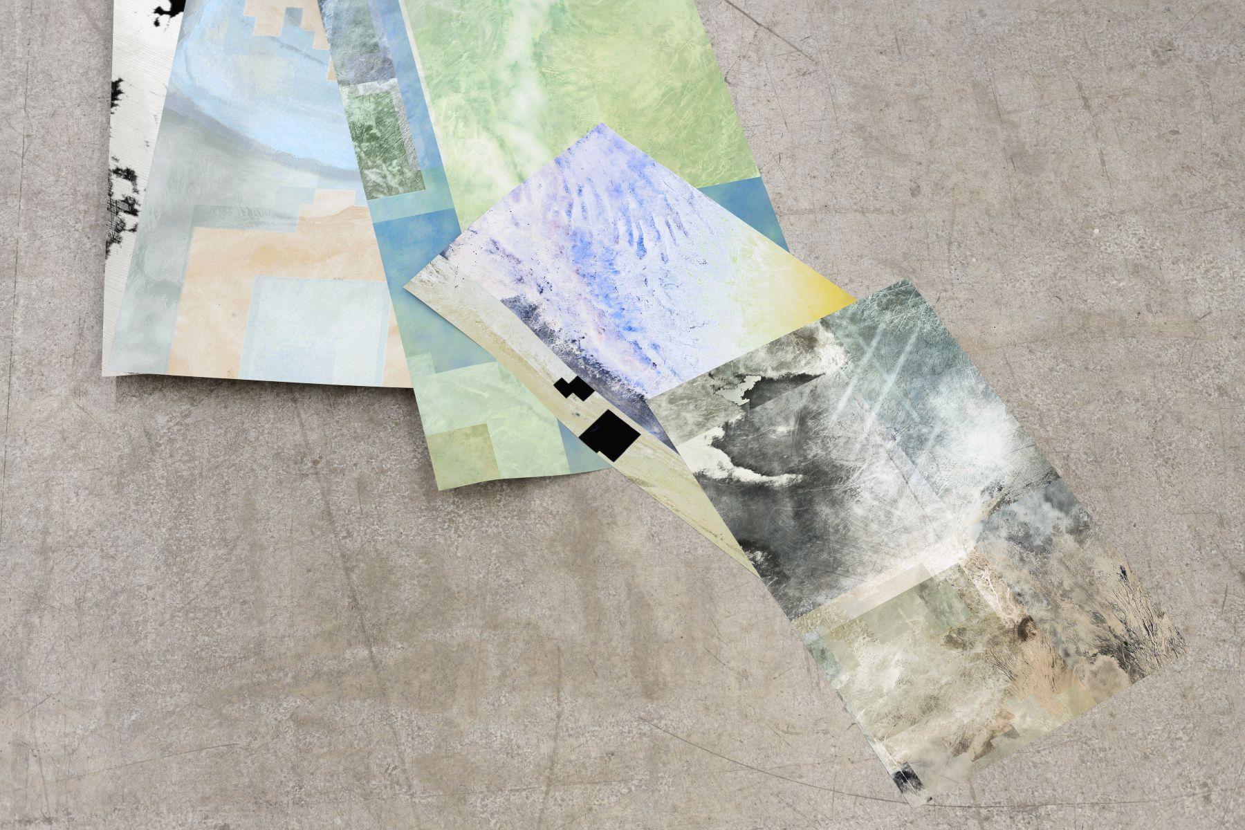 Solches Bildmaterial wird in Form von flach auf dem Boden liegenden, sich teils überlagernden Digitaldrucken gleichzeitig Sujet und Objekt. Im Blick auf diese – wie Flugblätter vom Himmel gefallenen – Reste einer fluide durchscannten Welt taucht man in eigenwillige, nahezu abstrakte beziehungsweise sich auflösende Formationen, die von Salzverkrustungen, Wolken und ihren Schatten oder Wasserlinien herrühren. Besonders auffällig sind darüber (oder darunter?) liegende Rasterstrukturen, die wie stark vergrößerte Pixel immer wieder auftauchen, als würden die Prints daran erinnern wollen, dass jeder manifest gewordene Blick auf die Welt eine kartografische Projektion ist, eine Übersetzung aus einer Dimension in die andere.
