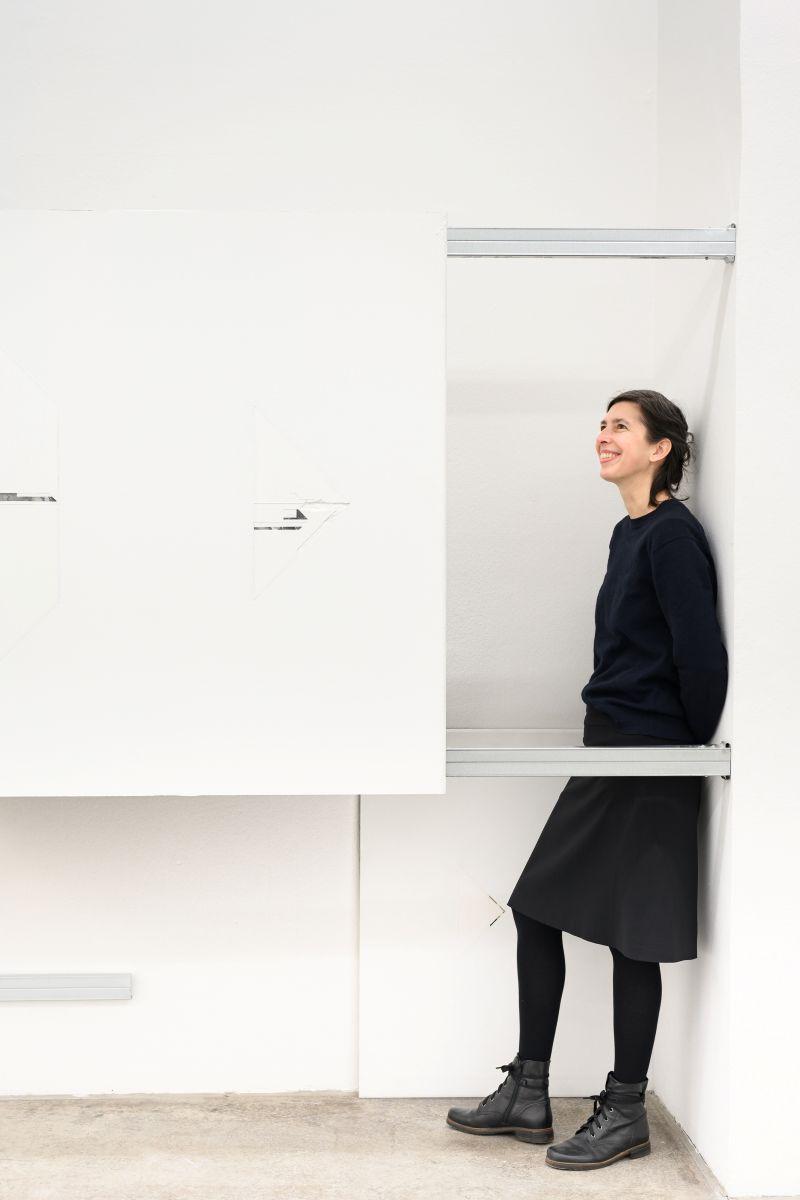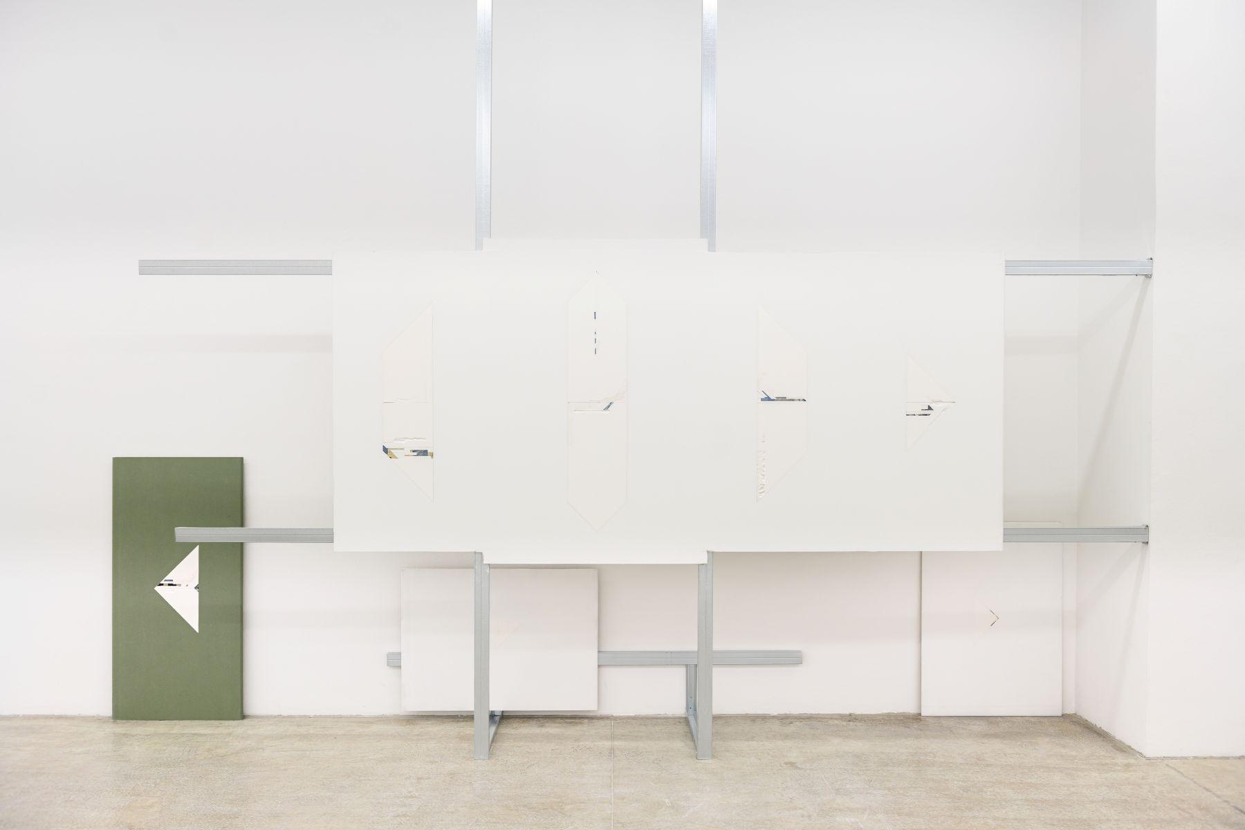In der Ausstellung Das Bild der Welt ist ein anderes spiegeln sich der Prozess der digitalen Bildentstehung, die Rasterflächen, die immer neu bestückt werden und das reale Bild der Erde zum Verschwinden bringen, im Raum wider. Das im Auf- oder Umbau begriffene Element aus Gipskarton – das Material der architektonischen Schimäre – suggeriert eine Art Navigationssystem und scheint so den digitalen Kontext des permanent Veränderbaren im Raum anzudeuten.