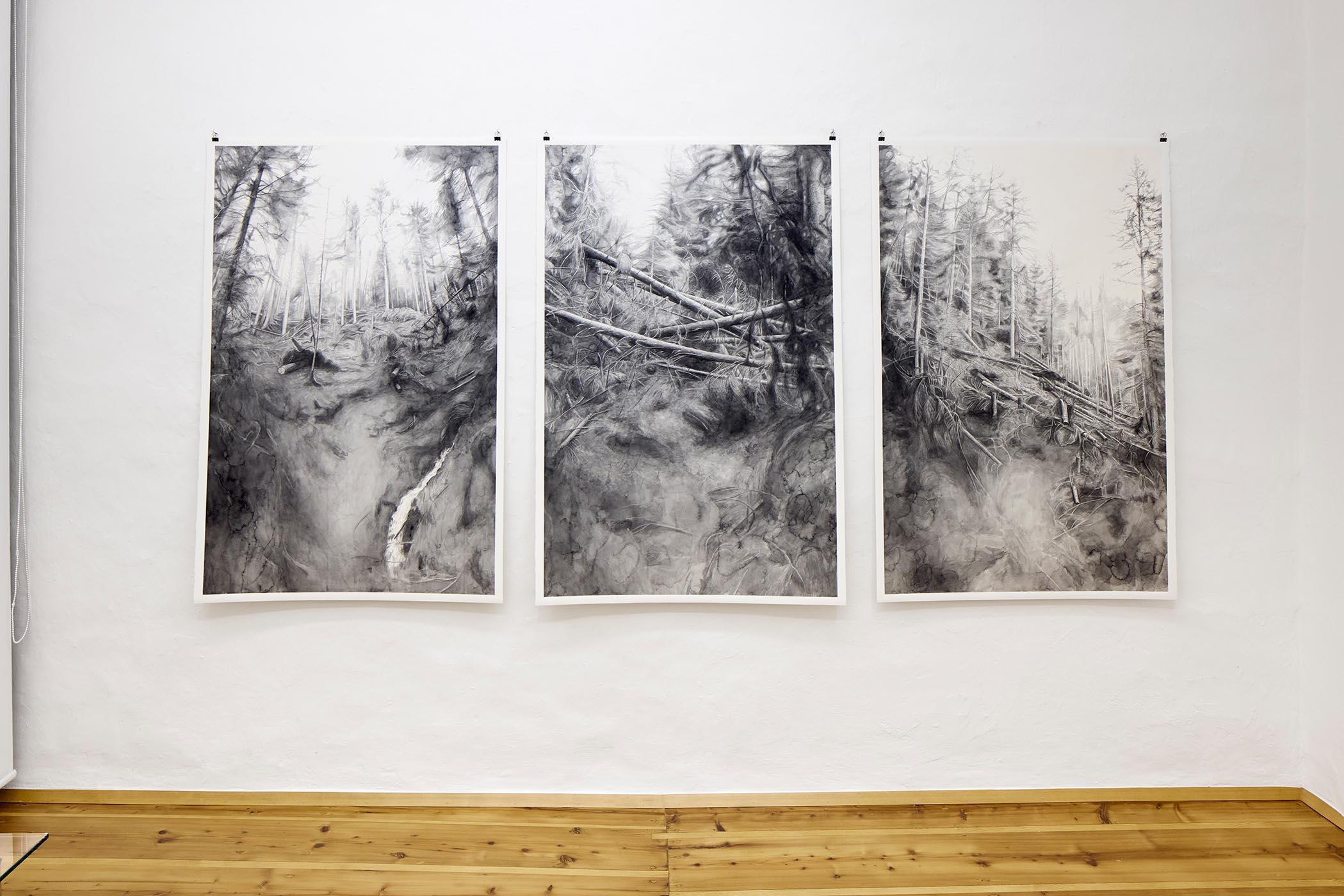 Im „Plus” sind Naturbilder, atmosphärisch dichte Schwarz-Weiß-Aquarelle und feine Zeichnungen von Alexandra Kontriner zu sehen: Die Aquarelle und Zeichnungen der in Lienz geborenen Künstlerin basieren auf genauer Naturbeobachtung und vertiefender Recherche. Sie thematisieren Prozesse ökologischer Veränderung und Anpassung. Dies zeigt sich sowohl in den maßstabsgetreuen Insektenzeichnungen zum Thema Biodiversität als auch in den filigranen und detaillierten Darstellungen von Pionierspezies wie Pflanzen und Flechten. In der Ausstellung präsentiert Kontriner außerdem eine Reihe von Aquarellen, in denen sie sich mit ihrem Heimatort und dem dortigen Waldsterben auseinandersetzt. Im Mittelpunkt steht das großformatige Schwarz-Weiß-Aquarell „Kosten“. Es ist nach dem Ort ihrer Kindheit benannt und zeigt den Wald kurz nach einem heftigen Sturm, der 2018 über Kärnten und Osttirol fegte.
