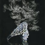 Tusche und Bleistift auf Papier, dichroitische Folie und Resin auf Glas