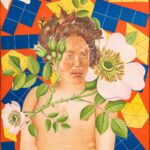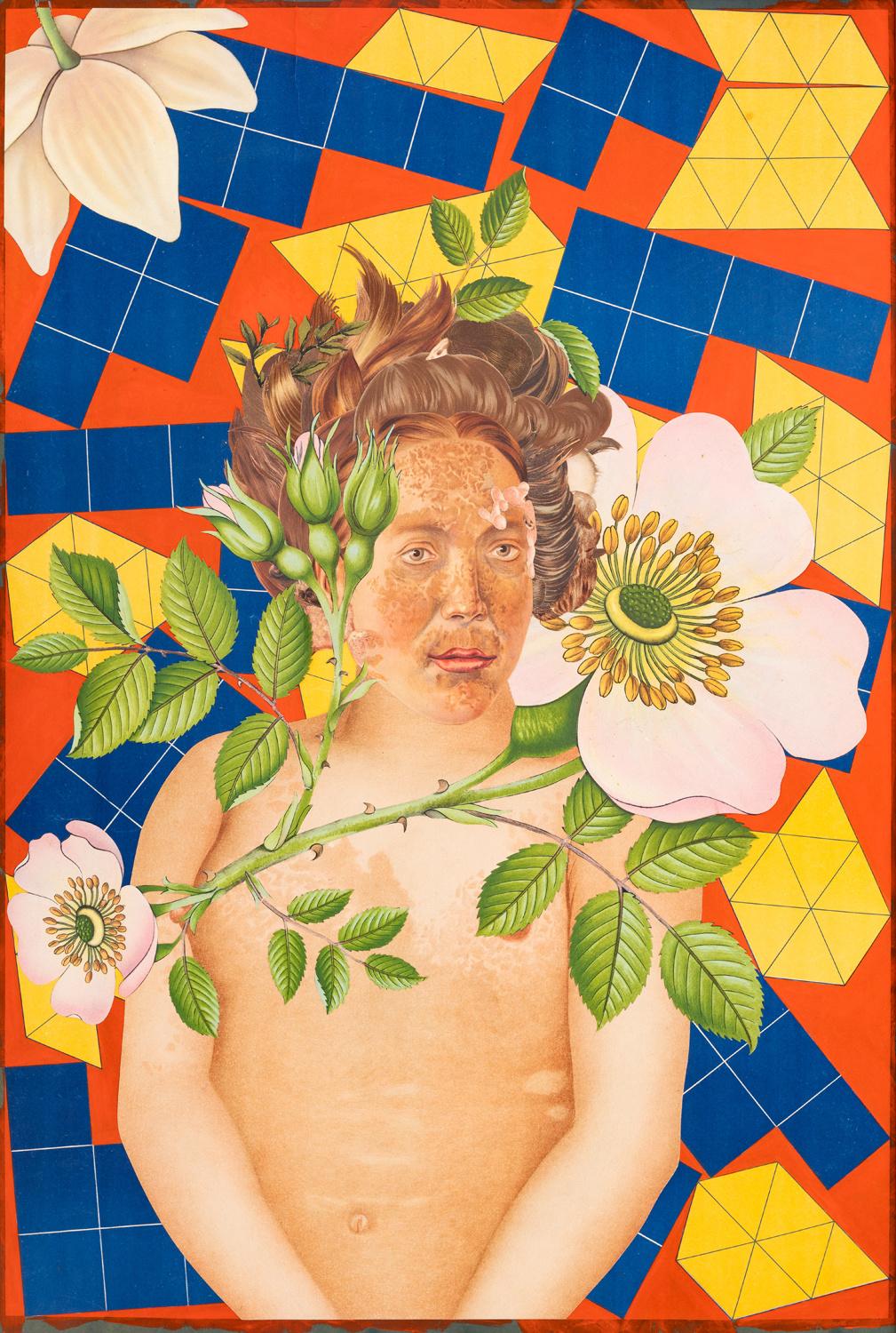 Collage (aus Originalmaterialien, analog; historische Drucke aus dem frühen 20. Jh.; botanische Wandtafeln, medizinische Bücher), koloriert, auf Papier, kaschiert auf Alu-Dibond, gerahmt
