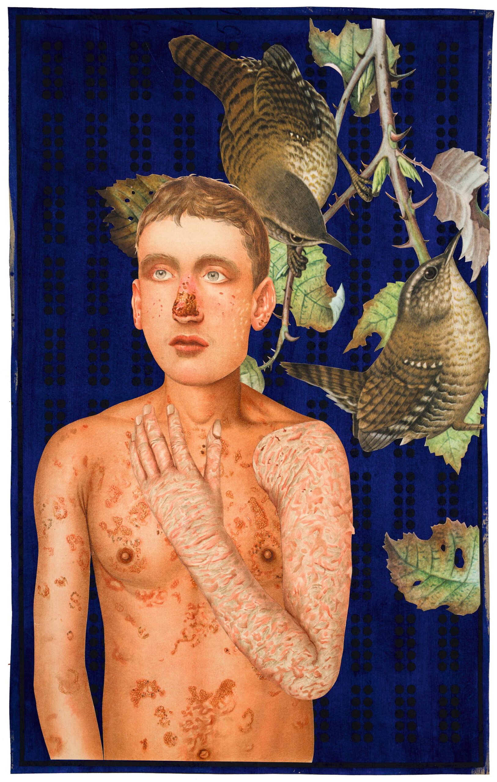 Collage (aus Originalmaterialien, analog; historische Drucke aus dem frühen 20. Jh.; botanische Wandtafeln, medizinische Bücher), koloriert, auf Papier, kaschiert auf Alu-Dibond, gerahmt