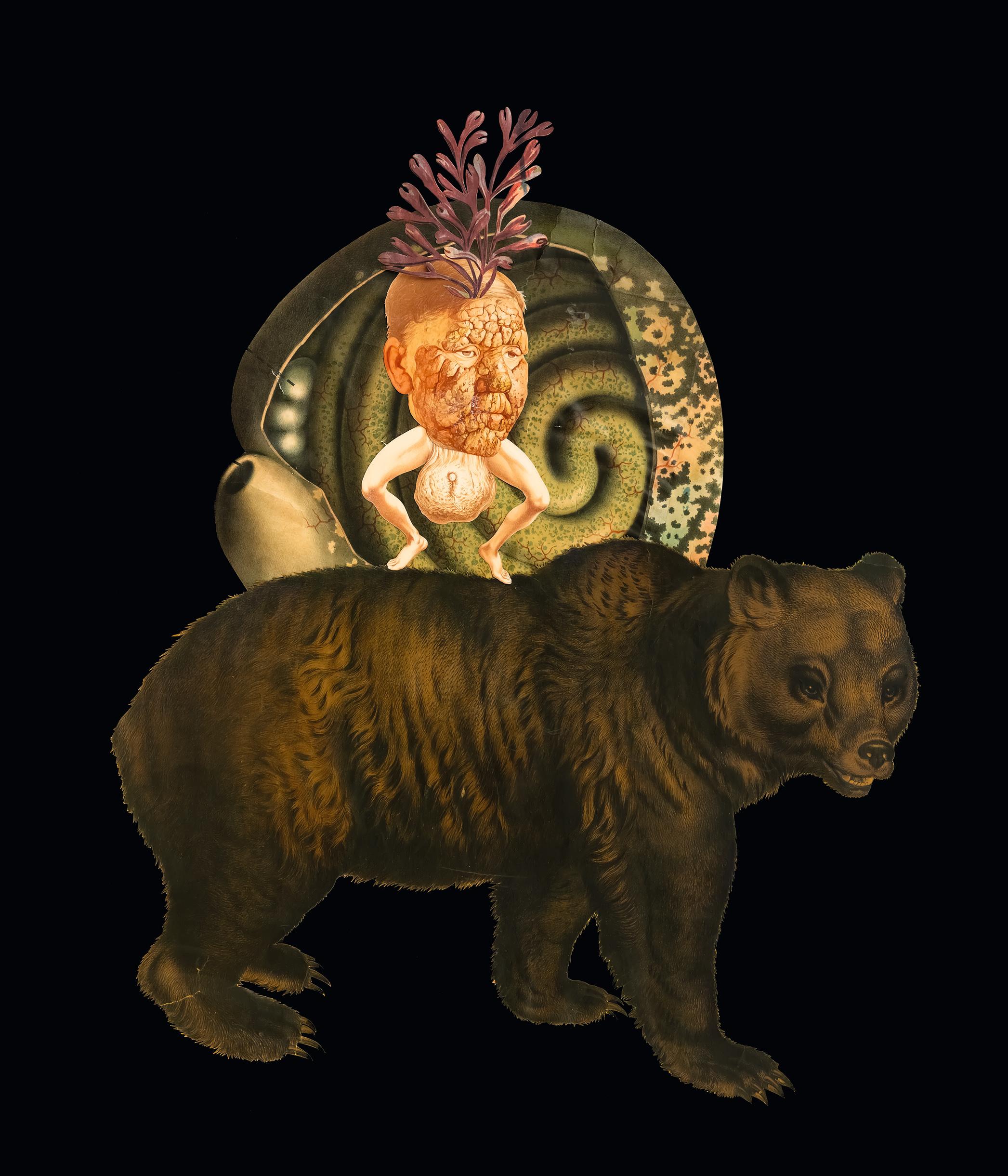 Collage (aus Originalmaterialien, analog; historische Drucke aus dem frühen 20. Jh.; botanische Wandtafeln, medizinische Bücher), auf Papier, kaschiert auf Alu-Dibond, gerahmt