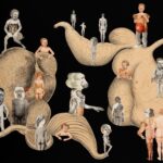 Collage (aus Originalmaterialien, analog; historische Drucke aus dem frühen 20. Jh.; botanische Wandtafeln, medizinische Bücher), koloriert, auf Papier, kaschiert auf Alu-Dibond, gerahmt