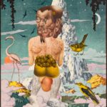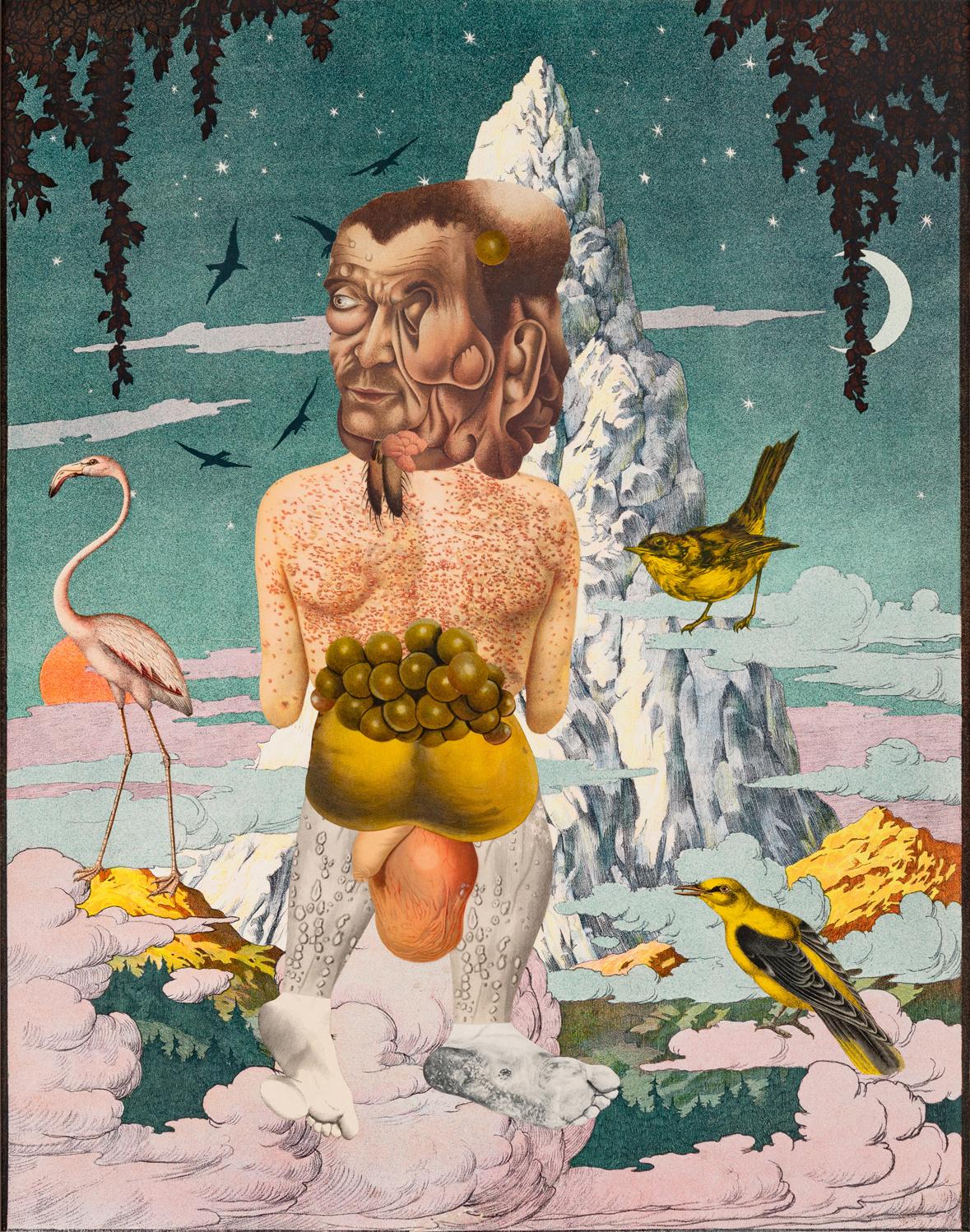 Collage (aus Originalmaterialien, analog; historische Drucke aus dem frühen 20. Jh.; botanische Wandtafeln, medizinische Bücher), auf Papier, kaschiert auf Alu-Dibond, gerahmt