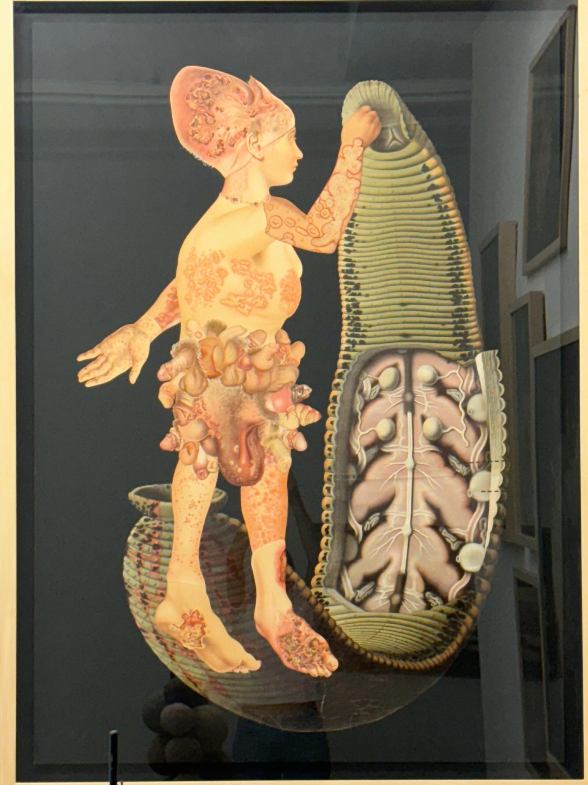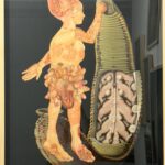 Collage (aus Originalmaterialien, analog; historische Drucke aus dem frühen 20. Jh.; botanische Wandtafeln, medizinische Bücher), koloriert, auf Kunststoffplatte, gerahmt