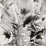 Tusche und Bleistift auf Papier, dichroitische Folie und Resin auf Glas
