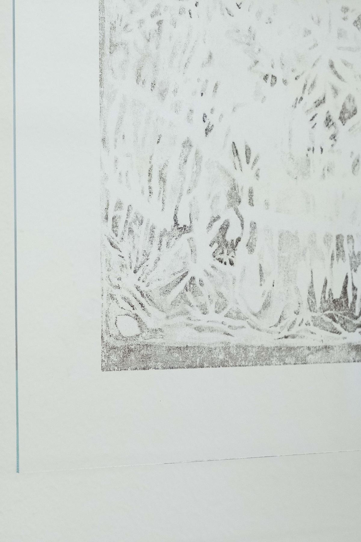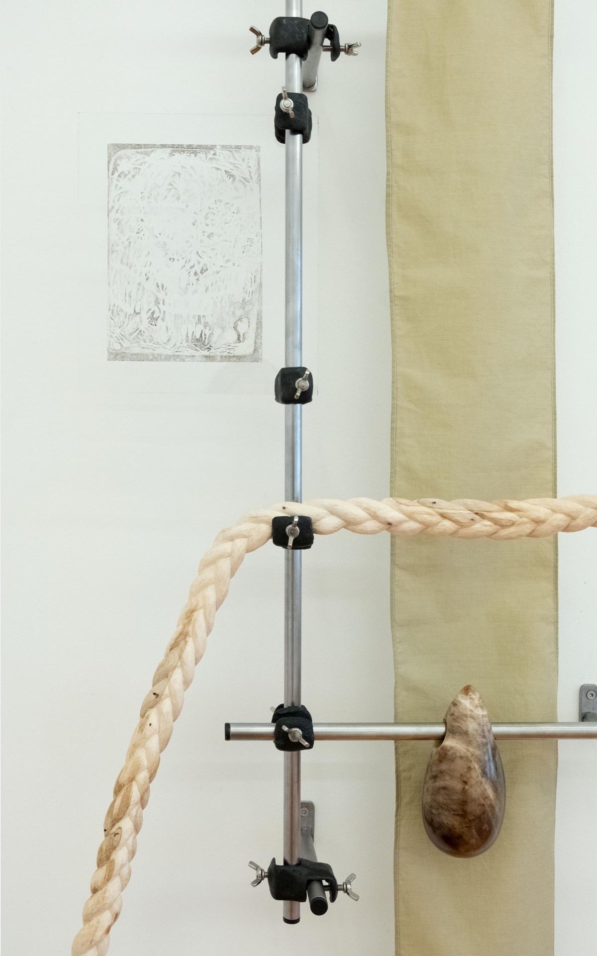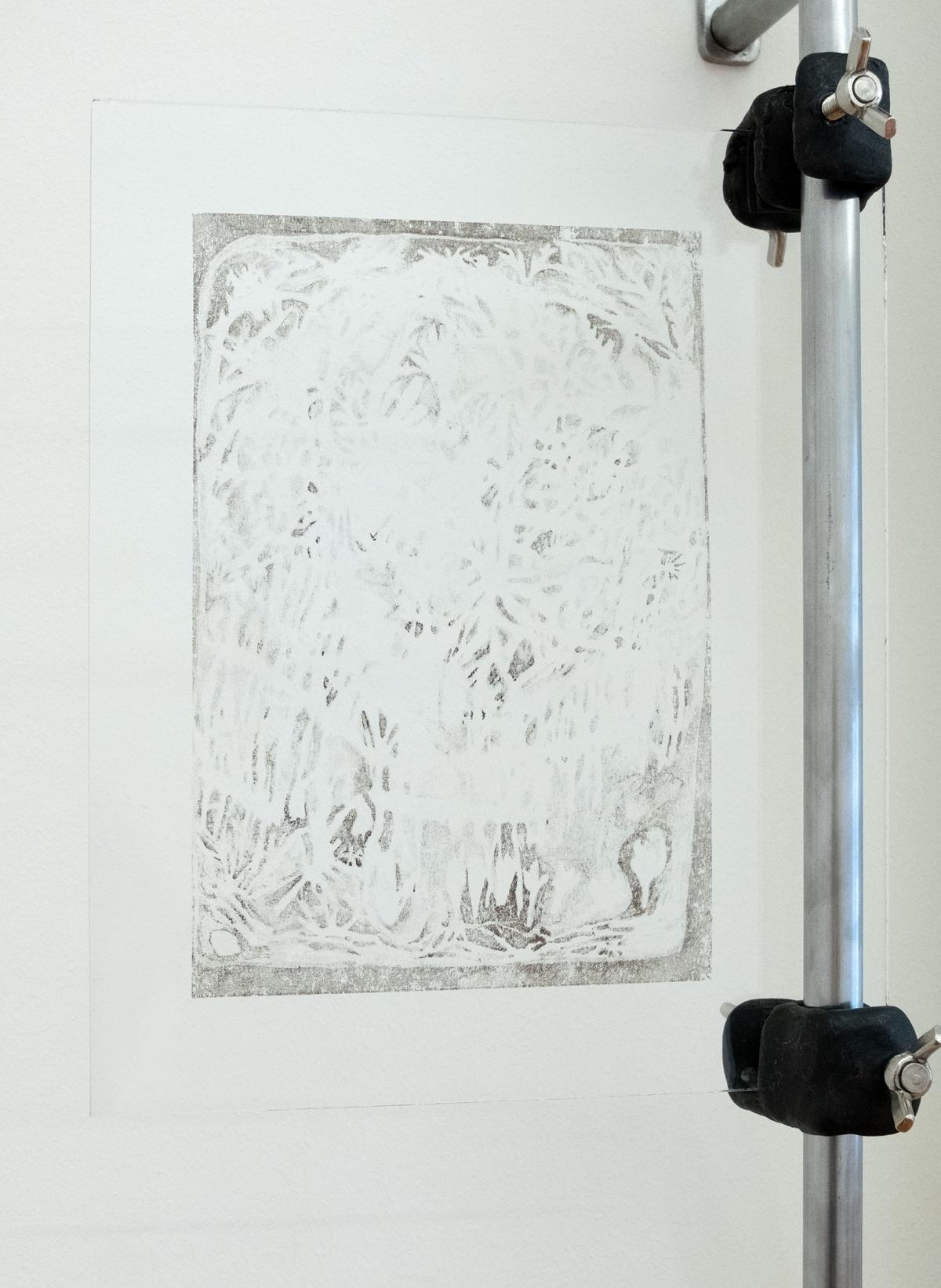 Frottage auf Glas, Holz, Stoff, Metall, Speckstein